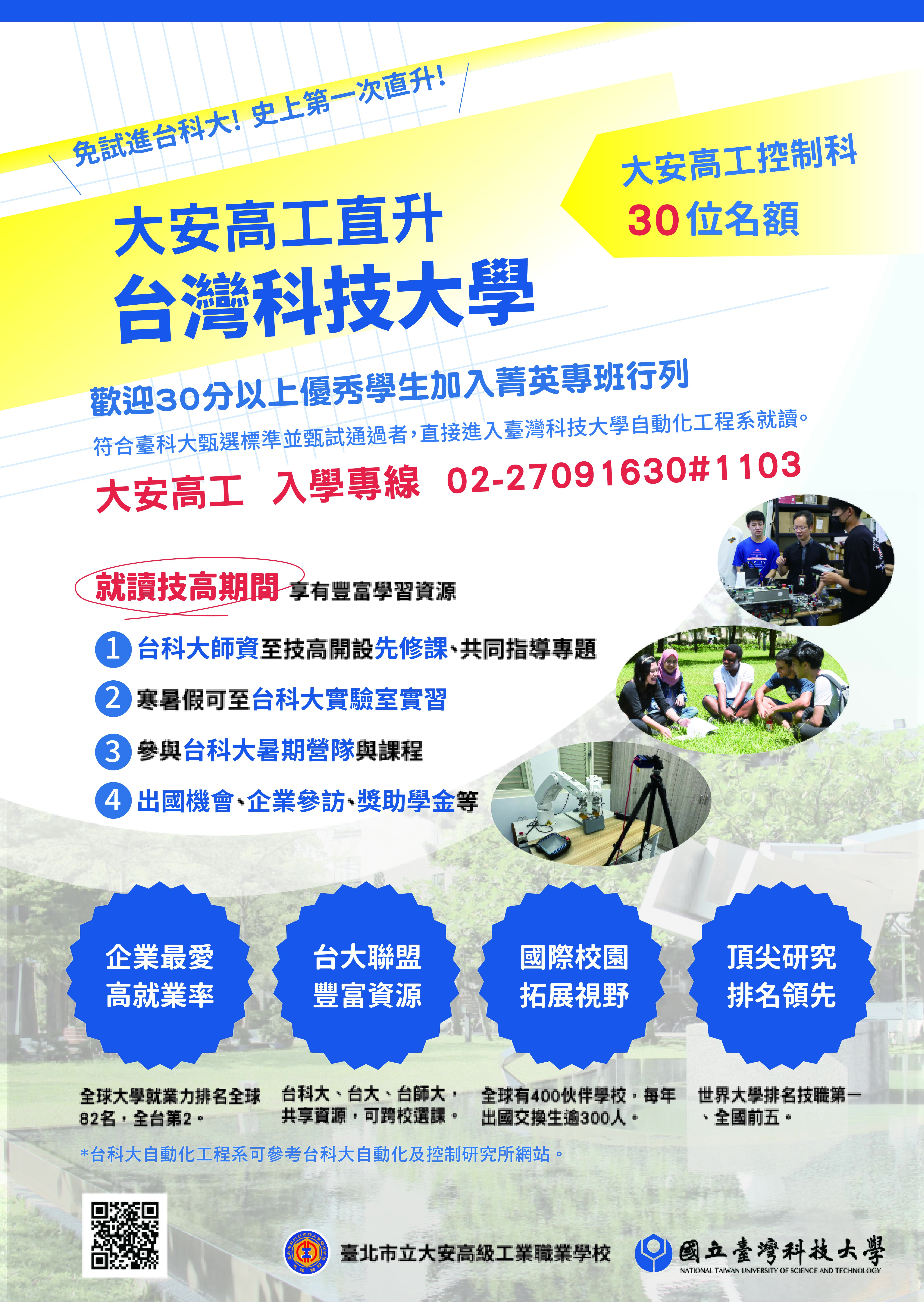 二、臺北市大安高工與國立臺灣科技大學合作3+2新五專模式「直升臺科大專班」,為具實作潛力學生打造直升國立科技大學的入學管道,鼓勵學生投入技職領域學習專業技術與實作。