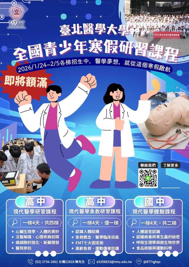 | 公告主旨 | 臺北醫學大學【全國青少年國中寒假研習課程】系列活動相關資訊。 |
