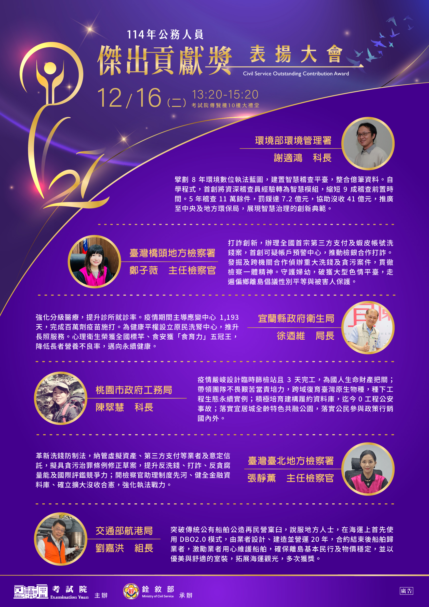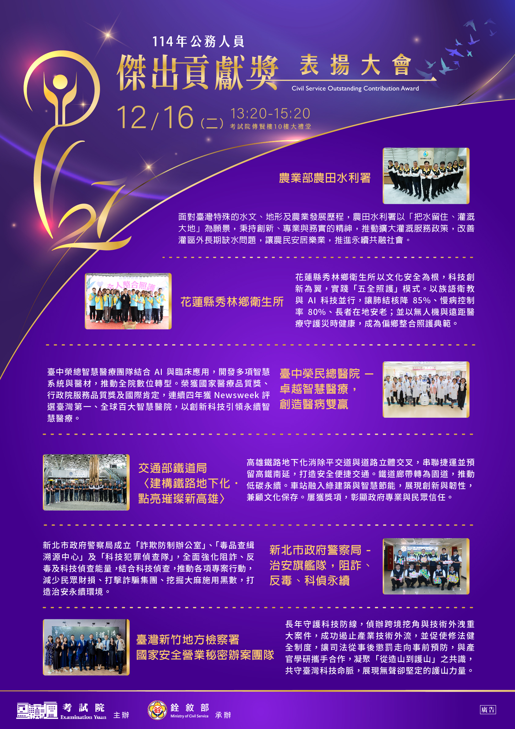 校園公告 公告主旨 銓敘部「114年公務人員傑出貢獻 獎表揚大會」電子海報 發佈日期 2025 年 11 月 26 日 發佈單位 人事室 公告類別 行政公告 公告等級 轉知 點閱次數 7 公告內容 相關附件 臺北市政府人事處 函 臺北市政府人事處 函 檔案名稱檔案大小檔案格式下載臺北市政府人事處 函.pdf162.76 KB新視窗開啟檔案「114年公務人員傑出貢獻獎表揚大會」電子海報1.jpg2.21 MB新視窗開啟檔案 臺北市政府人事處 函.pdf「114年公務人員傑出貢獻獎表揚大會」電子海報1.jpg 「114年公務人員傑出貢獻獎表揚大會」電子海報2 「114年公務人員傑出貢獻獎表揚大會」電子海報2 檔案名稱檔案大小檔案格式下載「114年公務人員傑出貢獻獎表揚大會」電子海報2.jpg2.41 MB新視窗開啟檔案 「114年公務人員傑出貢獻獎表揚大會」電子海報2.jpg 【2025-11-26】轉知財團法人佳音教育基金會受教育部委託辦理「課室英語實踐力— ... 【2025-11-26】轉知國立新竹科學園區實驗高級中等學校辦理114學年度「運動百靈 ...