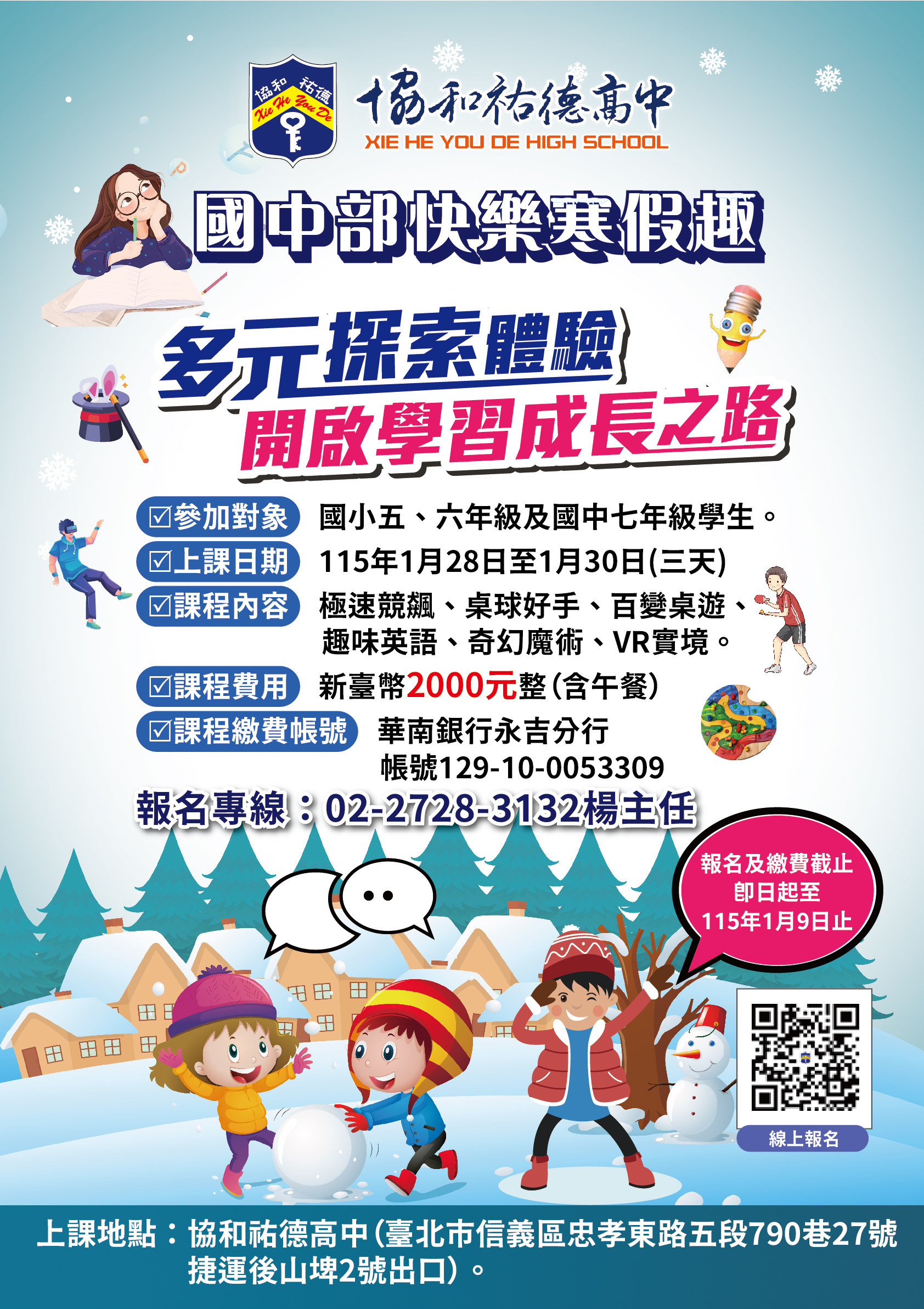 | 公告內容 | 一、目的:透過多元的主題特色營隊,提供學生有別於學校單一科目的學習,從探索體驗及趣味的活動中,學習團隊合作及提升人際社交,以開啟學習成長之路。 二、活動主題:快樂寒假趣。 三、辦理單位:臺北市協和祐德高中。 四、活動日期:115年1月28日(星期三)至1月30日(星期五)。 五、參加對象:凡114學年度在學國小五、六年級及國中七年級學生。 六、活動費用:每人2,000元(含午餐)。 七、活動場地:臺北市協和祐德高中(臺北市信義區忠孝東路五段790巷27號,捷運後山埤站2號出口)報名專線:(02) 2728-3132 楊主任。 八、實施計畫詳如附件。 |